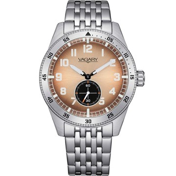 Orologio Vagary by Citizen solo tempo da uomo della collezione FlyBoy Piccoli Secondi, con movimento al quarzo. Cassa in acciaio. Diametro cassa 40 mm. Vetro minerale. Quadrante color bronzo e indici con numeri arabi. Bracciale in acciaio con chiusura deployante con pulsanti. Impermeabilità 10 bar. Referenza: IB2-013-91