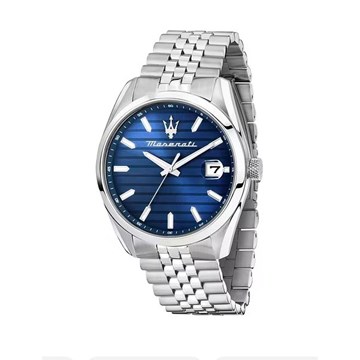 Orologio Maserati da uomo, della collezione Attrazione, con movimento al quarzo. Datario. Vetro minerale. Quadrante blu. Cassa in acciaio. Diametro cassa 43mm .Bracciale in acciaio con chiusura deployante e clip di sicurezza. impermeabilità 5 atm. Referenza: R8853151028