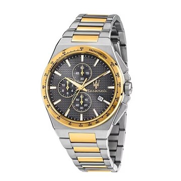 Orologio Maserati da uomo, della collezione Velocità. Movimento al quarzo. Datario. Vetro minerale .Cassa in acciaio. Diametro cassa 41mm.Bracciale in acciaio con chiusura deployante e pulsanti. Colore cinturino: oro e silver. Impermeabilità 5 atm.