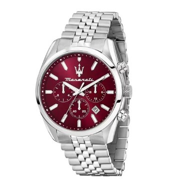 Orologio Maserati da uomo della collezione Attrazione . Cassa in acciaio di diametro 43 mm. Vetro minerale. Cinturino con chiusura Diver con blocco di sicurezza. Movimento al quarzo e resistenza all'acqua fino a 5 atm