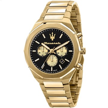 Orologio Maserati Cronografo da uomo, della collezione Stile, con movimento al quarzo. Vetro minerale. Quadrante nero. Cassa in acciaio con finitura dorata. Diametro cassa 45 mm. Bracciale in metallo con finitura dorata e chiusura con fibbia deployante con due pulsanti. Fondello serrato a vite. Impermeabilità 10 atm. Referenza: R8873642001