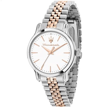 Orologio Maserati da donna, della collezione Epoca, con movimento al quarzo. Vetro minerale. Quadrante bianco. Cassa in acciaio con finitura lucida. Diametro cassa 34 mm. Bracciale in maglia jubilee bicolore silver/oro rosa con chiusura fibbia deployante con pulsanti. Impermeabilità 100 m. Referenza: R8853118520