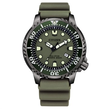 Orologio Citizen della collezione Promaster, diver's Eco Drive 200 mt. Diver's professionale certificato ISO 6425. Movimento Eco-Drive (a carica di luce infinita), con riserva di carica di 180 giorni. Funzione solo tempo. Cassa in acciaio con finitura IP grey. Ghiera girevole unidirezionale. Indici e sfere ad alta luminosità. Diametro cassa 44 mm. Cinturino in morbido poliuretano verde e chiusura a fibbia con ardiglione. Fondello e corona serrati a vite. Vetro minerale. Quadrante verde.