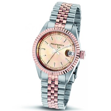 Orologio solo tempo da donna di Philip watch della collezione Caribe. Movimento al quarzo. Funzione datario. Cassa in acciaio con lunetta zigrinata e finitura oro rosa. Diametro cassa 31 mm. Quadrante rosč e indici a bastoni. Vetro zaffiro. Bracciale in acciaio maglia jubilee bicolore silver/rosč con chiusura deployante con pulsanti e clip di sicurezza. Corona e fondello serrati a vite. Impermeabilitą 100 metri. Referenza: R8253597603
