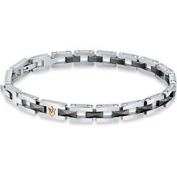 Bracciale da uomo di Maserati della collezione Ceramic. Bracciale realizzato in acciaio con maglie modulari e ceramica nera, con logo pvd oro giallo ad una estremità. Lunghezza 22 cm regolabile. Referenza: JM422ATZ16