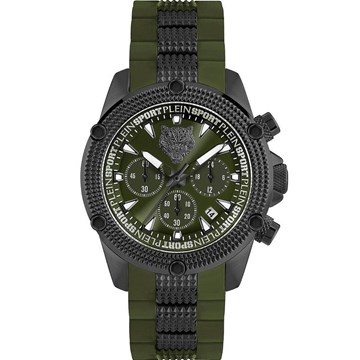 Orologio cronografo da uomo di Plein Sport della collezione Hurricane. Movimento al quarzo. Cassa in acciaio Ip nero con finitura satinata. Diametro cassa 44 mm. Quadrante verde con logo a ore 12. Vetro minerale. Funzione datario. Cinturino in silicone verde con chiusura a fibbia con ardiglione. Impermeabilità 50 metri. Referenza: PSDBA0223