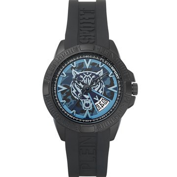 Orologio solo tempo da uomo Di Plein Sport della collezione Touchdown. Movimento al quarzo. Cassa in acciaio Ip nero con finitura lucida e lunetta opaca con incisione scritta "PLEIN SPORT". Diametro cassa 44 mm. Quadrante camouflage colore blu con logo centrale. Funzione datario. Vetro minerale. Cinturino in silicone nero con scritta "PLEIN SPORT" in rilievo e chiusura a fibbia con ardiglione. Impermeabilità 50 metri. Referenza: PSFBA0523