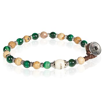 Bracciale Gerba Lab 53. Bracciale da uomo, realizzato in cordino cerato marrone con lavorazione macramè, sfere occhio di tigre verde, paesina, elementi in metallo anallergico e chiusura a bottone in argento 925. Diametro sfere 6 mm. Lunghezza cm 21. Referenza: LAB 53
