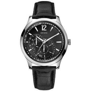 Orologio Guess Vessel Uomo. Cassa in acciaio lucido, quadrante nero con dettagli silver - Multifunzione - Cinturino in pelle nero stampato coccodrillo. Funzionamento a batteria.