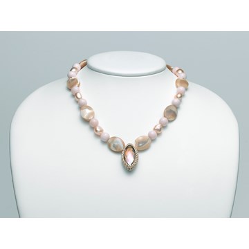 Collana Miluna della collezione I Segreti Della Terra. Argento 925/1000 Nr. 6 Perle Oriente barocca Col. Orange 10-11 Nr. 1 Pietre color pink Taglio Navette mm 33X18 Nr. 0,4 Madreperla gold Ovale mm 20X15 Fl. 0,585 Aragonite Col.Rosa Tondo mm 10. Referenza: PCL4748