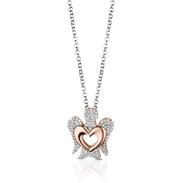 Collana da donna di Roberto Giannotti della collezione Angeli, in argento. Pendente angelo in argento rosato con cuore e zirconi bianchi. Lunghezza catena 50 cm. Dimensioni angelo: base 2 cm - altezza 2,4 cm. Referenza: GIA319